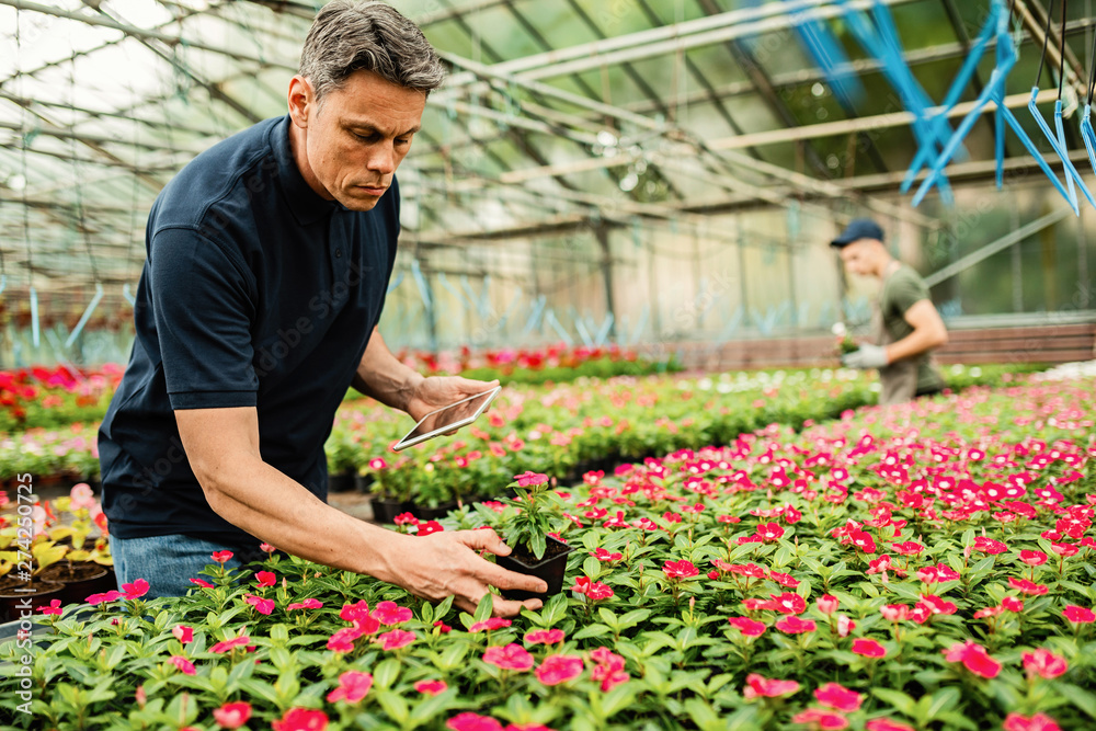 Plant Nursery Worker Examining Flowers While Using Touchpad Stock Photo Adobe Stock